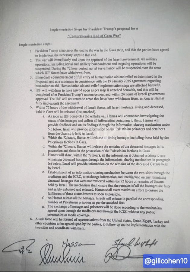 Greetings, all. We are just days from the possible return of the Israeli hostages—jubilation. I have made this a free, long article looking at all aspects of the proposed ceasefire deal. All I asked is that you share it. Fox On War is a reader-supported publication. To receive new posts and support my work, consider becoming a free or paid subscriber. A deal was inevitableAs of this morning, the ceasefire is in effect—for now. After two years of relentless conflict in Gaza, the war between Israel and Hamas has ended not with a decisive victory, but with an inevitable negotiated settlement that might still fall apart. From the start, it was clear that no matter how fierce Israel’s campaign against Hamas was, it would ultimately lead to some form of agreement with the very group it sought to eliminate. This reality is uncomfortable for Israel: any deal with Hamas demands painful concessions. Nonetheless, the White House ultimately prevailed over all other interests. The only good thing to come out of the UN during the last two years is that Trump seized the opportunity at the General Assembly to bribe, threaten, and cajole leaders across the Middle East to pressure Hamas into reasonable negotiations, then put Bibi in a headlock until he accepted the deal on the table. Kudos to Trump. It would have saved a lot of suffering if only a world leader had had the spine to do this two years ago. Phase OneThe first phase of the Gaza peace plan focuses on a hostage-prisoner exchange, a swap that Israel’s government has agreed to despite its bitterness. Under the deal, Hamas and other Gaza militant factions will release the dozens of hostages they have held since the 7 October attacks, including all remaining Israelis (around 20 believed alive) and even the bodies of those killed in captivity. In return, Israel will release a large number of Palestinian prisoners from its jails, reportedly over a thousand inmates. This list allegedly includes some 250 individuals serving life sentences (many convicted of deadly attacks) plus roughly 1,700 Gazans who were detained in the sweeps following the 2023 Hamas onslaught. For Israeli society, watching convicted terrorists walk free is a bitter pill to swallow, but one worth the cost. Many of those being freed were involved in brutal crimes; their jubilant homecomings will be extremely hard for victims’ families and the broader Israeli public to stomach. Yet these difficult concessions were the price to pay to secure the release of Israelis who had been held hostage for so long. For Hamas, entering into this deal demands its own difficult compromises as Trump’s machinations leave them isolated from the allies who have kept them in the fight for two years, notably Qatar and Turkey. On one side, Hamas’s leaders have assured the mediators that they will follow the ceasefire terms, release all hostages held, and accept certain restrictions on their military actions. On the other side, Hamas must demonstrate strength to its supporters and allies, maintaining the domestic image that it is still a viable operator in Gaza. Striking a balance between these two demands will be challenging and could influence how lasting the truce ultimately proves to be. Hamas has already sown doubt. Officials from the group have claimed that they do not know the whereabouts of every hostage. They maintain that other armed factions in Gaza might be holding some captives or have been lost amidst the chaos of war. This could be partly true: smaller militant groups like Islamic Jihad initially took some hostages and may not fully abide by Hamas’s ceasefire. It could even be a cynical tactic by Hamas to buy time and prolong Israeli anxiety, keeping the pain of uncertainty alive. In any case, by suggesting it cannot locate all captives, Hamas sets the stage either to justify incomplete compliance or to gradually delay hostage releases, gaining maximum leverage and publicity with each batch. However, the deal, as reported, contains clauses to bypass these delays. We will see what prevails. Gili Cohen has the scoop on the ceasefire implementation text: Hamas’s leadership also faces internal and external pressure over how this deal influences perceptions of victory or defeat. Publicly, they are already promoting the prisoner release component as a triumph – evidence that armed resistance forced Israel to concede. Indeed, seeing hundreds of Palestinians freed is a major propaganda victory for Hamas, which can claim it achieved through resistance what negotiation alone never could. At the same time, Hamas must be careful not to seem as if it has sold out or surrendered. Some members of its base will scrutinise any sign of Hamas disarming or relinquishing control of Gaza. The group’s political wing will likely emphasise that it agreed only to a temporary ceasefire and humanitarian measures, not to its own dissolution. Hamas’s leaders will walk a fine line: fulfilling any promises made to President Trump’s envoys enough to keep the agreement alive, while also using defiant rhetoric to reassure Palestinians that Hamas remains strong and unbroken. We can expect Hamas-controlled media and mosques in Gaza to portray the ceasefire as a tactical pause, possibly even a strategic victory, rather than a capitulation. How convincingly Hamas manages this balance will influence whether hardline factions split off or whether the ceasefire holds without major breaches. One immediate test of Hamas’s post-war strength will be how it manages the fractious internal landscape in Gaza, where power dynamics have shifted during the conflict. Over the past year, Israel quietly encouraged and armed local Palestinian clan-based militias to rise up as an alternative to Hamas’s rule. This was a deliberate part of Israel’s strategy once its forces invaded parts of the Strip. By exploiting old resentments and promising weapons or autonomy, Israel succeeded in activating certain powerful families 