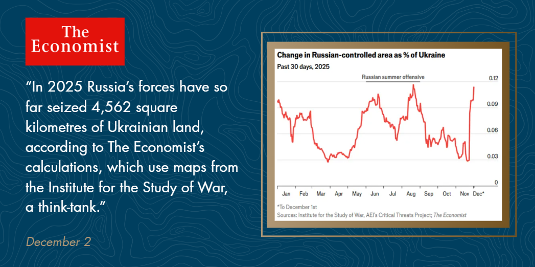 ISW’s view of the world as of the end of last month. Marc Liebman https://www.marcliebman.com https://www.facebook.com/marcliebmanauthor/ https://www.youtube.com/channel/UC_sDoFQM5wupNaCeGIvKL1g From: ISW Publications <publications@understandingwar.org> Reply-To: "publications@understandingwar.org" <publications@understandingwar.org> Date: Tuesday, January 6, 2026 at 9:51 AM To: Marc Liebman <marc@marcliebman.com> Subject: Intel Brief: December 2025 Newsletter Monthly Research Update from ISW [https://7et4umoab.cc.rs6.net/on.jsp?ca=3d3980bc-481f-4429-8c21-d2813ffaf887&...] [https://files.constantcontact.com/c9ccf499301/d52445dc-0e5d-4239-a10c-175a18...] December 2025 Support ISW<https://7et4umoab.cc.rs6.net/tn.jsp?f=001B79AZYKfFaVRvJweB-P3XyEyEiuNI-JAguS-O5P7m9o5qSYADywuYowqplJrEoyjCNHES_KOi9caW6BInwzeJnOrNwyASEElj6cINJuQonqONUYxJEY7zglex1gbh-9DL9oSdzajHnzupWBohvK3WrxK5Srr8wx0vBM4ktK4Jphh7f8WG5vJxTUF2szLHKCkTLJlHut5B2fTk_kvUpAh3tXPOZpNtnhe2s4v6vWLZYsUZFYSGh6E_lHDorGcpJmedTqJ11zcY3oMPkqQC7GYIiBlMzuaX8d3DfdYq5EKnrLb09eDllMcvPO9G9Q6XqG8_RvsC46zqYU=&c=6AwN2oRohmdk53u5kjvdyX3veXu78jULg454GhYLIRWJqhXQFS-VWA==&ch=C7ydCG_lkehd1gJQVq0sRYldTWy8s0JgNTRkz1o9Ey8xCS3IuovzYg==> Dear ISW readers, Each month, the ISW editorial team distills our research teams’ reports and assessments of the war in Ukraine, the Chinese Communist Party’s paths to controlling Taiwan and relevant cross–Taiwan Strait developments, and the security challenges in the Middle East to provide you with an understanding in brief of the past month’s happenings across our research portfolios. December's Highlights On December 31, China Analysts Matthew Sperzel and Daniel Shats and China Researchers Alison O’Neil and Jackson Karas published the Special Report: Surprise PRC Military Exercise Around Taiwan<https://7et4umoab.cc.rs6.net/tn.jsp?f=001B79AZYKfFaVRvJweB-P3XyEyEiuNI-JAguS-O5P7m9o5qSYADywuYn0VO3GSp90z5mG8SedNTa-KJK4uZTKCw0cl3KNwLpfnIlz863UIW8A_9OsdHDyCnnu_7mfNBcOL0f_lT-r58hOfaVk48yjwy4a3mgBpgM8HVggAy05P-r2NnliN75tjoQe-rUFR8heq&c=6AwN2oRohmdk53u5kjvdyX3veXu78jULg454GhYLIRWJqhXQFS-VWA==&ch=C7ydCG_lkehd1gJQVq0sRYldTWy8s0JgNTRkz1o9Ey8xCS3IuovzYg==>, analyzing the December 29-30 Justice Mission 2025 exercise. [https://files.constantcontact.com/c9ccf499301/28fd0d18-53d3-4de3-975b-59309521b05f.gif?rdr=true]<https://7et4umoab.cc.rs6.net/tn.jsp?f=001B79AZYKfFaVRvJweB-P3XyEyEiuNI-JAguS-O5P7m9o5qSYADywuYn0VO3GSp90z5mG8SedNTa-KJK4uZTKCw0cl3KNwLpfnIlz863UIW8A_9OsdHDyCnnu_7mfNBcOL0f_lT-r58hOfaVk48yjwy4a3mgBpgM8HVggAy05P-r18w91j1HnbT3EgD6_LQxXg&c=6AwN2oRohmdk53u5kjvdyX3veXu78jULg454GhYLIRWJqhXQFS-VWA==&ch=C7ydCG_lkehd1gJQVq0sRYldTWy8s0JgNTRkz1o9Ey8xCS3IuovzYg==> In the Media<https://7et4umoab.cc.rs6.net/tn.jsp?f=001B79AZYKfFaVRvJweB-P3XyEyEiuNI-JAguS-O5P7m9o5qSYADywuYqHQSWCLgIEo4g67BobNysLqpkH4xO_YGnVJUohU_I196uV0JY5LbA50vIarjjPvTSS51urULTy0qbSTFL2rMTsJJ66g73ROgl7Flsp650nkNx_a4SzElImcJ-4WFjxy_1Nj0-pINvZOXp57_8Z3Gm6yVyAF0Ca3A_68m9_9BqbZ&c=6AwN2oRohmdk53u5kjvdyX3veXu78jULg454GhYLIRWJqhXQFS-VWA==&ch=C7ydCG_lkehd1gJQVq0sRYldTWy8s0JgNTRkz1o9Ey8xCS3IuovzYg==> [https://files.constantcontact.com/c9ccf499301/d9040670-25f9-4d2e-a2b3-d9b43a059f5a.png?rdr=true]<https://7et4umoab.cc.rs6.net/tn.jsp?f=001B79AZYKfFaVRvJweB-P3XyEyEiuNI-JAguS-O5P7m9o5qSYADywuYhOGs_SGsblugM6H6cPpyOOqTROELvFnVWPpUUXgXx0jf0wNNB1MmvjSAeRSJnKTdg28Dgx7fMdmrwyiGXgGBSnZUW7puTDDPGAI7o_lfNNlGUw60VD1lHyWr0nhASLStwbdOxcO5_xmTEjgIm3bXfokbn8Fe_Rrkesoc5KaX3OCNrU4K6kYplTt26twayzDsytt-2I_IvJFbemCzEGBjqQqGqJw7nyYHg==&c=6AwN2oRohmdk53u5kjvdyX3veXu78jULg454GhYLIRWJqhXQFS-VWA==&ch=C7ydCG_lkehd1gJQVq0sRYldTWy8s0JgNTRkz1o9Ey8xCS3IuovzYg==> [https://files.constantcontact.com/c9ccf499301/88e939f6-2cea-438f-b509-9b74aa07c80b.png?rdr=true]<https://7et4umoab.cc.rs6.net/tn.jsp?f=001B79AZYKfFaVRvJweB-P3XyEyEiuNI-JAguS-O5P7m9o5qSYADywuYhOGs_SGsblunZbqeZsko5cEK1Lr3tQotyxVYlCU6sWKF5nuzTR8pzeIrKF-jnzfbjQh6y-v4batN0oh0C1HsG182jK3hKhEjkXL9wjI8t1FM99xSExqIIsd-TkKnNi4Ro1yCoicOeds-zQ8VsoUUM-f6hOMi3s98fUKrtnGLT3eqqMSyzmEmb0Kvj1BjbyZ2f_3Ws7Ll0aypo4lFLl6PW4=&c=6AwN2oRohmdk53u5kjvdyX3veXu78jULg454GhYLIRWJqhXQFS-VWA==&ch=C7ydCG_lkehd1gJQVq0sRYldTWy8s0JgNTRkz1o9Ey8xCS3IuovzYg==> “The Kremlin has weaponized this issue [of missing Ukrainian children] in order to ingratiate themselves with the Trump administration.” — National Security Fellow Karolina Hird, The Free Press<https://7et4umoab.cc.rs6.net/tn.jsp?f=001B79AZYKfFaVRvJweB-P3XyEyEiuNI-JAguS-O5P7m9o5qSYADywuYhOGs_SGsbluz_2q8G7Y_u1XLpfEVpN1YrDGaixv84ugNBOGxOo8xT_KrunuhsBKfIDuKBMKyVSZIrvQ5ITKitKfHTH4gQbV99tkavOj8jCEbz9MhX-J-2esJuVM2BoKszCy-RPjgps-esWpFV1dRf60E1-u1__PIwghwiJLkLv-e-bbhSlAlc1AfgnDkWCLDQ==&c=6AwN2oRohmdk53u5kjvdyX3veXu78jULg454GhYLIRWJqhXQFS-VWA==&ch=C7ydCG_lkehd1gJQVq0sRYldTWy8s0JgNTRkz1o9Ey8xCS3IuovzYg==>, December 16 “The fall of Pokrovsk will free up Russian combat power…Russia will have the flexibility to redeploy elements of at least two combined arms armies (CAAs) that are currently fighting in Pokrovsk elsewhere on the frontline.” — Russia Researchers Jessica Sobieski and Jennie Olmsted, RBC-Ukraine<https://7et4umoab.cc.rs6.net/tn.jsp?f=001B79AZYKfFaVRvJweB-P3XyEyEiuNI-JAguS-O5P7m9o5qSYADywuYhOGs_SGsbluWNMRxkQFmkUl75IWSi9JAhACWpvXdocy1X3otuFr-IIp-t8E6YJsFmIxLGq2g6YJgs16Hp9U6EQ3QvJG-L9Vhscrx9bhugQ8h9jDVF7hfbtZCIF0tT69PDasaYJC2kh4dvYQcID013XfGKhNQJLkW-ks8Os34tcWS3gUqvFQEqvPAK9VYVwZdNAkAeln-fLKZZpFB9LdinMk21AACbwziWkTZKh1zRkDSoX5Aj6NBiTzGYZrWCGRCg==&c=6AwN2oRohmdk53u5kjvdyX3veXu78jULg454GhYLIRWJqhXQFS-VWA==&ch=C7ydCG_lkehd1gJQVq0sRYldTWy8s0JgNTRkz1o9Ey8xCS3IuovzYg==>, December 18 When Ukraine conducts a deep strike against Russia, there are normally “reports from local civilians and government about drones or drone debris, footage of drones flying overhead or air defenses activating, and footage—often geolocated—of fires, smoke plumes, or explosions…we have not yet observed any of these with the claimed strike targeting Putin’s residence.” — Russia Analyst Grace Mappes, WSJ<https://7et4umoab.cc.rs6.net/tn.jsp?f=00