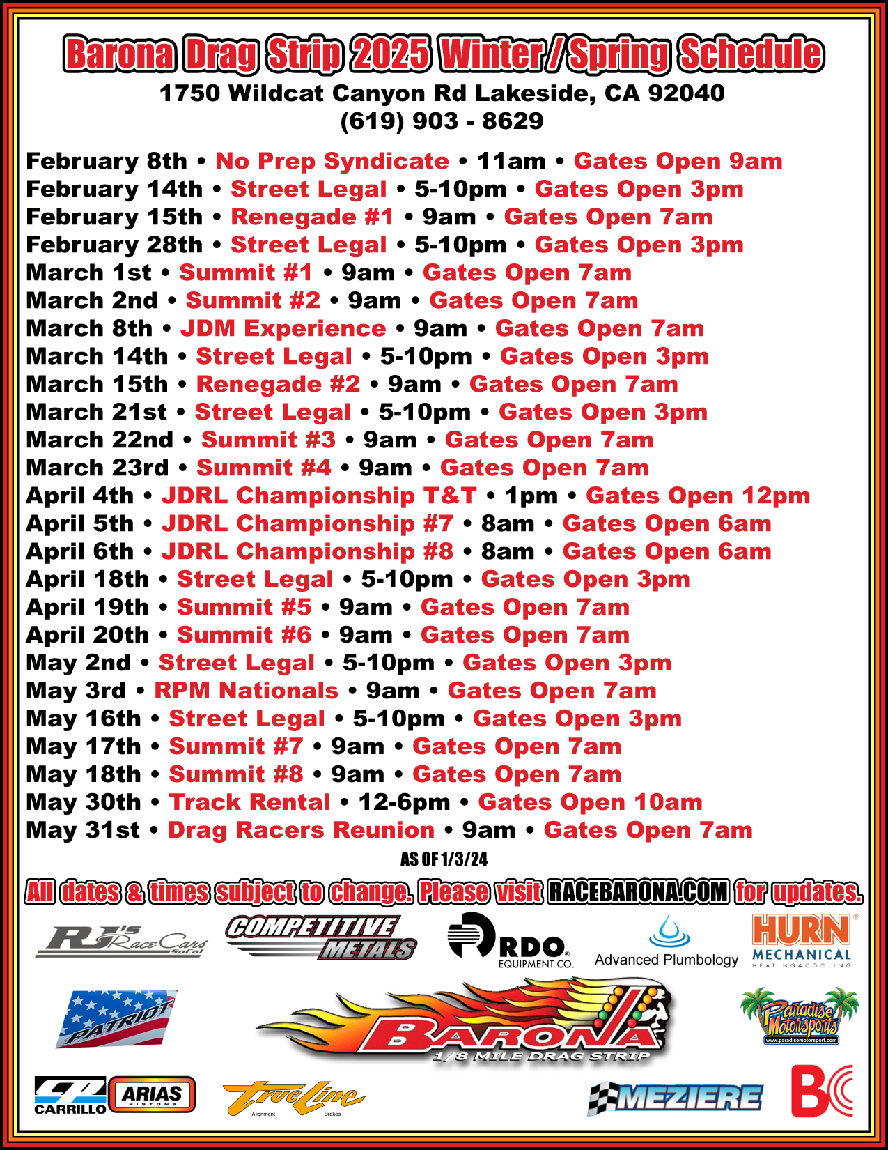 <https://www.brattland.org/current-event-calendar/> https://www.brattland.org/current-event-calendar/ SAN DIEGO CAR GUYS (SDCGs) EVENT CALENDAR WEEK OF 10/26/2025 <https://www.brattland.org/vehicles-for-sale/> Cars for Sale on SDCarGuys <https://www.facebook.com/marketplace/item/1954325141978256> 1929 Ford Model A Roaster <https://www.brattland.org/1974-chevrolet-corvette-stingray-for-sale/> 1974 Chevrolet Corvette Stingray <mailto:sandiegocarguys@brattland.org> sandiegocarguys@brattland.org To sign up for the SDCGs Email list, go to: <https://www.brattland.org/mailman/listinfo/sandiegocarguys> https://www.brattland.org/mailman/listinfo/sandiegocarguys Recommended 1932-1979 Ford Parts <http://www.cgfordparts.com> www.cgfordparts.com Dorothy Bangiola C&G Ford Parts 1941 Commercial St. Escondido CA 92029 760-740-2400 <http://www.cgfordparts.com> www.cgfordparts.com Send your calendar updates for the SDCGs Events Calendar to <mailto:mgbrattland@gerlecreek.com> mgbrattland@gerlecreek.com Wordpress Website Creation, Management, Email, etc. $35 per hour, <mailto:mgbrattland@gerlecreek.com> Mike Brattland 619 454-0496 10/29 Every Wednesday Wednesday Breakfast Group, El Cajon, 8 am Bonnys Café 596 Broadway gotta drive em El Cajon Classic Cruise 5pm-7:30pm, Main & Magnolia - Downtown El Cajon (Address for GPS is 200 E Main St. El Cajon 92020), Info: 619-201-8207 Starts ? 2026 La Mesa Car Show-Cruzin La Mesa Starts ? 2026 Cruin Grand in Escondido Starts ? 2026 10/31 Every Friday <https://www.goodoleboyssandiego.com/wp-content/uploads/2022/10/IMG_1714-sca led.jpg> Cars on Main Street Off Season Shows, In front of American Retro 245 E. Main St. El Cajon, Car Gathering, Bring your chairs. Free to all makes & Models, Park, Cars Eat, Talk Friday Nights Start 3PM, Sun Mornings, Start 7am November thru June Gotta drive em 11/1 First Saturday In-n-Out Burger, Poway, 1030AM to 1:00PM Poway Cruisers Cruise In Off Scripps Poway Pkwy & Community Rd, 12890 Gregg Ct All makes, models, years and everyone welcome Info: Shawn Hodgetts <mailto:shodgetts@cox.net> shodgetts@cox.net gotta drive em 11/22 Fourth Saturday Cars & Coffee Event, El Cajon, 8:30am Foothills Church 365 W. Bradley Ave. gotta drive em 11/1 Every Saturday Donut Derelicts, Huntington Beach, 6:30am Adams Ave. Donuts @ Magnolia Info <mailto:info@rodshows.com> info@rodshows.com gotta drive em 11/1 Every Saturday Rods & Relics, Bonsal, 7am Z Café Hwy 76 & Mission Road gotta drive em 11/1 Every Saturday Dunkers & Clunkers, Bonita, 7am Bonita Donuts 4414 Bonita Rd "Behind B of A and Arco Station" Info 619-426-1882 gotta drive em 11/1 Every Saturday Poinsettia Village Shopping Center Cars & Coffee, Carlsbad, 7am South west corner of Hwy 5 and poinsettia drive exit. gotta drive em 11/1 Every Saturday Oceanside Cruisers Breakfast, Oceanside, 8:30am Start Fresh Cafe 1034 S. Coast Hwy. gotta drive em 11/1 Every Saturday South Orange County Cars & Coffee, San Clemente, 9am Outlets of San Clemente South West corner 11/2 First Sunday Mary's Donuts, 8959 Carlton Hills Blvd. in Santee from 7 to 9 am. Open to east county cars 11/16 3rd Sunday Cars and Coffee, La Mesa, 7am La Mesa Blvd. between Spring and 4th gotta drive em 11/2 Every Sunday Cars and Coffee Kit Carson Park, Escondido, 8am 2025 11/9 <https://www.longbeachhiposwapmeet.com/> Long Beach High Performance Show & Swap Meet 11/ <https://www.brattland.org/wp-content/uploads/2025/01/raffleblackangus2025-5 .pdf> 23 Black Angus Steakhouse Car Show, South Bay Cruisers, Free Event, 707 E Street, Chula Vista, CA 91909. 4th Sunday of the month 10:30am-1:30pm, Paul Stanzione 619-778-0395 <mailto:pkstanzione@yahoo.com> pkstanzione@yahoo.com. The dates are: Jan 26, Feb 23, Mar 23, Apr 27, May 25, Jun 22, Jul 27, Aug 24, Sep 28, Oct 26, Nov 23. 12/7 Pomona Swap Meet & Classic Car Show, Meet , Fairplex, Pomona Info <https://www.pomonaswapmeet.com/> https://www.pomonaswapmeet.com/ <https://maps.google.com/maps?q=Gate+17+%4034.083243,-117.773216&hl=en&sll=3 5.830521,-85.978599&sspn=4.052333,7.174072&t=m&z=15&iwloc=A> 1101 W McKinley Avenue, Pomona, CA 91768 714 538-7091 Open to all year vehicles 12/14 <https://www.longbeachhiposwapmeet.com/> Long Beach High Performance Show & Swap Meet 2026 Important Websites <http://myhotrodindex.atwebpages.com/> Bill Jansens Australian Hot Rodding Website <https://www.overdrivehotrodnews.com/> OVERDRIVE HOT ROD NEWS <http://www.big3partsexchange.com/> Big 3 Parts Exchange <https://racebarona.com/> Barona Dragstrip <https://www.sandiegoassociationofcarclubs.org/fulllistofevents> San Diego Car Club Council Calendar Over The Hill Gang San Diego <http://www.overthehillgang.com/> <https://www.prowlers.org> Prowlers <https://www.powaycruisers.com> Poway Cruisers <http://www.eastcountycruisers.com/> East County Cruisers Car Club <https://theheartbeatclassics.com/> HeartbeatClassicsCar Club <http://www.streetmasters.org/> StreetMasters Car Club <https://southbaycruisers.org/> South Bay Cruisers Car Club <https://www.westcoastwillysclub.com> West Coast Willys Club <https://www.good-guys.com/> GoodGuys <https://nsra-usa.com/> NSRA <http://www.socalcarculture.com/events.html> SOCAL Car Culture Calendar Recommended Vendors <http://www.chariotsoffiresuvs.com/> Chariots of Fire San Diego Brian Nebergal, SoCal Classic Autoglass Connection, Escondido, Ca, 760-807-8968 or email at <mailto:socalclassicautoglassconnection@msn.com> socalclassicautoglassconnection@msn.com <https://qualityrestorations.com/> Steering Wheel Restorations San Diego <mailto:dennisqualityrestorations@gmail.com> E-Mail Dennis Crooks CDR Mike Brattland, USN (Ret.) <mailto:mgbrattland@gerlecreek.com> mgbrattland@gerlecreek.com <mailto:mgbrattland@brattland.org> mgbrattland@brattland.org Admin/Moderator SanDiegoCarGuys List & Calendar of Events <mailto:sandiegocarguys@brattland.org> sandiegocarguys@brattland.org 619 454-0496 38 Willys 2 Dr Sedan Webmaster for <http://www.brattland.org/> www.brattland.org <http://www.overthehillgang